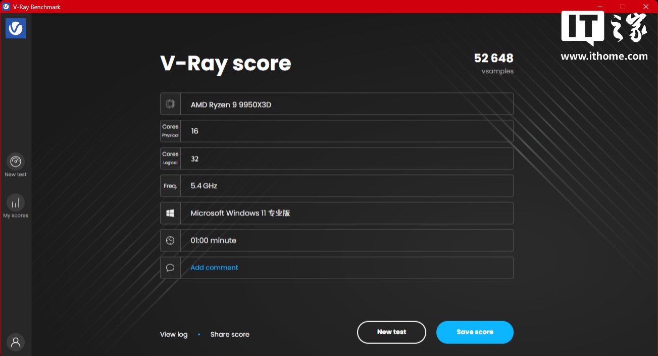 在考验 CPU 渲染能力的 V-Ray Benchmark 6.0 基准测试中,锐龙 9 9950X3D 的 CPU 渲染成绩为 52648 分。