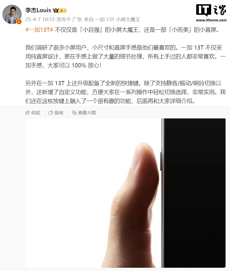 此外,一加 13T 上还升级配备了全新的快捷键,取代传统的三段式静音按键。一加中国区总裁李杰此前预热内容如下: