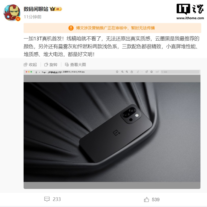 IT之家 4 月 14 日消息,博主 @数码闲聊站 今日晒出了一加 13T 的真机外观,图中为云墨黑配色,该机还有晨雾灰和怦然粉两款浅色系。