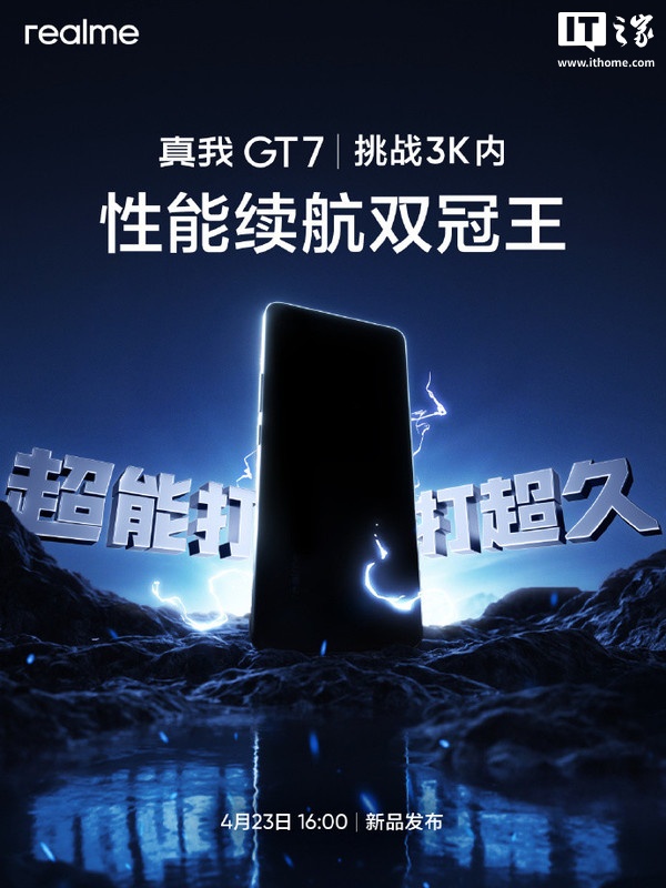 IT之家 4 月 14 日消息,天玑 9400+ 性能旗舰机型真我 GT7 将于 4 月 23 日 16 时正式发布,官方宣称将挑战 3000 元以内的性能、续航“双冠王”。