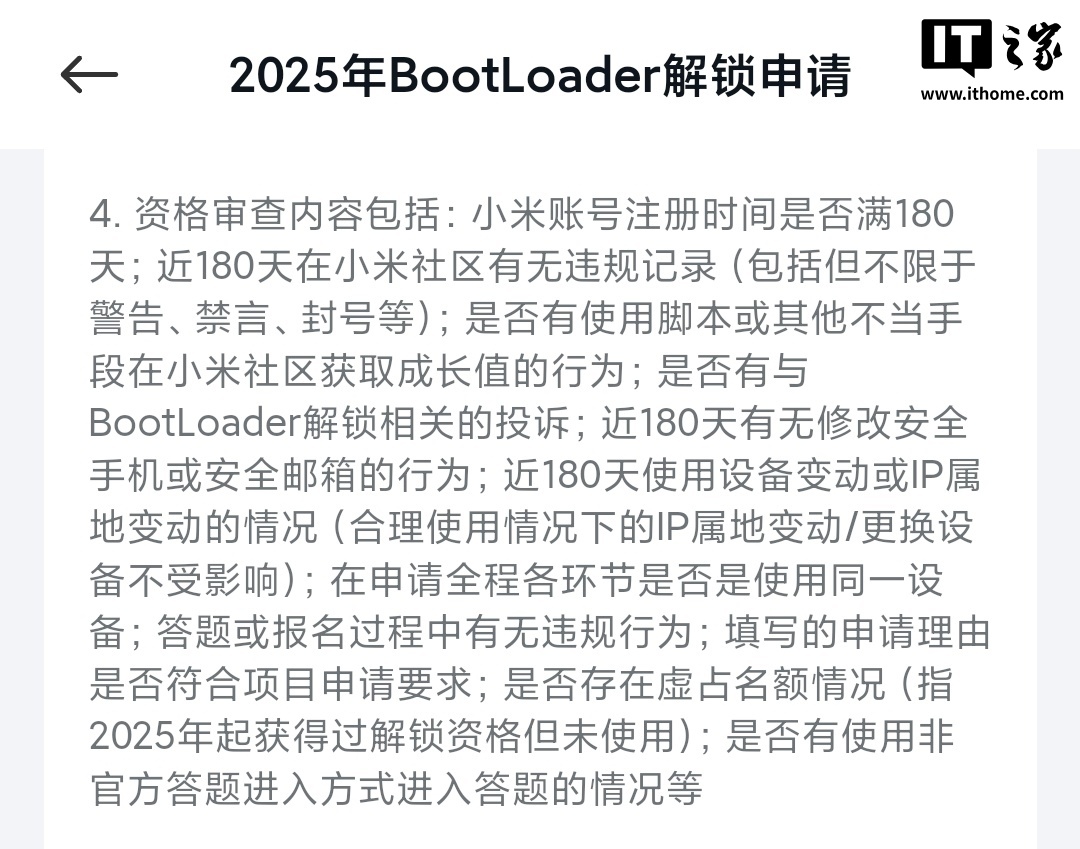 IT之家 4 月 14 日消息,小米日前更新了 2025 年 BootLoader 解锁申请规则,在资格审查说明部分,新增了“是否有与 BootLoader 解锁相关的投诉”。
