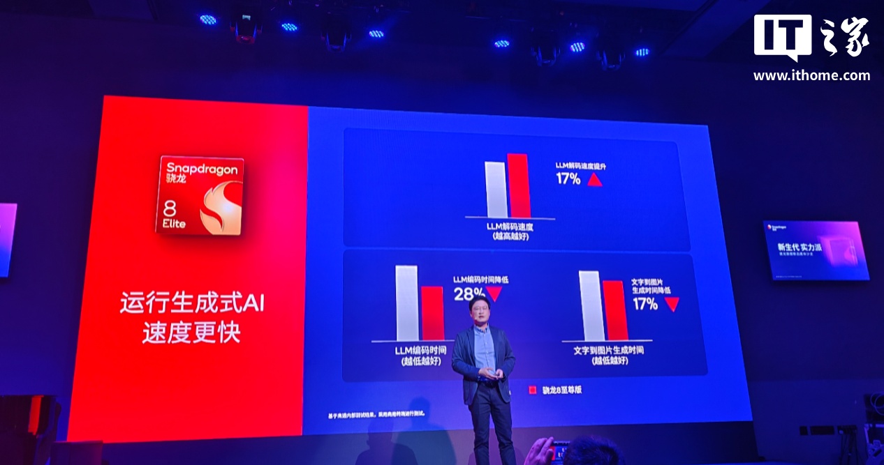 不仅如此,在骁龙 8 至尊版上,高通 AI 引擎有着大幅升级,得益于更强的 Oryon CPU、Adreno GPU 以及 Hexagon NPU 等模块,骁龙 8 至尊版实现了 AI 性能 45% 的提升,同时最高单瓦性能(能效)也提升了 45%。