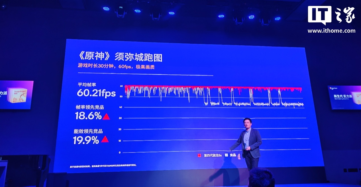 而在 60fps 极高画质夏使用《原神》进行 30 分钟须弥城跑图,第四代骁龙 8s 平台可取得 60.2fps 的成绩,帧率领先竞品 18.6%,能效领先竞品 19.9%。