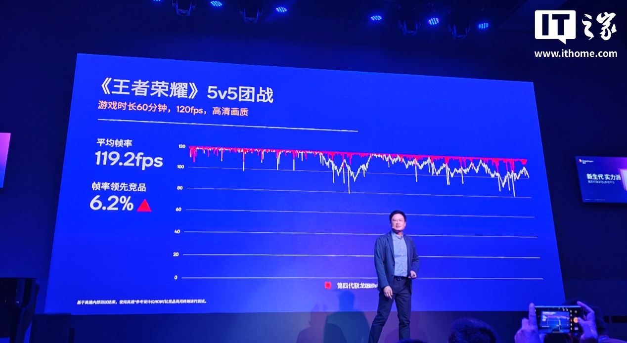 实际游戏表现方面,第四代骁龙 8s 平台可以在 60 分钟《王者荣耀》5v5 团战(120fps,高清画质)中取得 119.2fps 的平均帧率,领先竞品 6.2%。