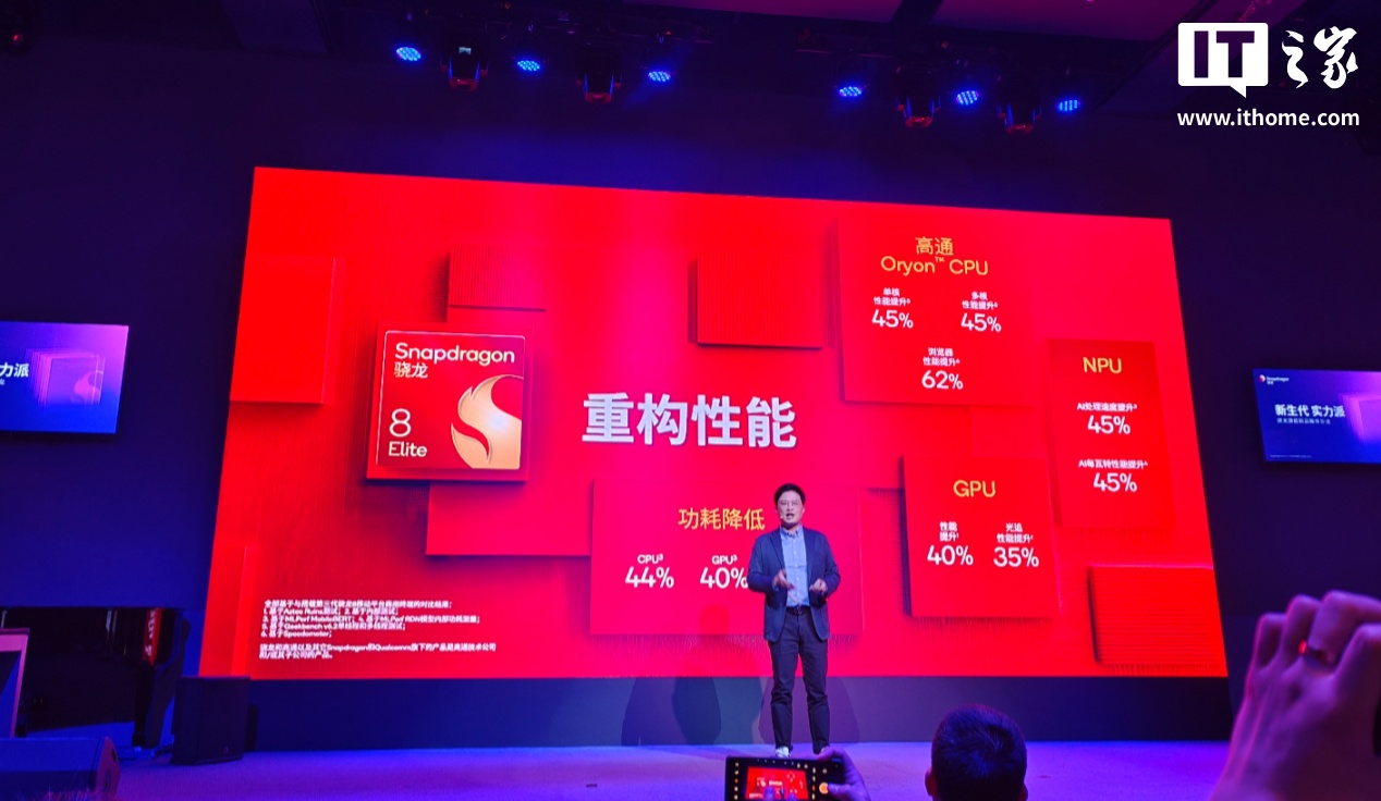 例如在性能上,骁龙 8 至尊版全新的高通自研 Oryon 架构 CPU,在 GeekBench 的测试结果中,其 CPU 单核性能提升达到 45%,多核性能提升也高达 45%。而骁龙 8 至尊版搭载的 Adreno GPU 相较于上一代在性能上实现了 40% 的提升,同时功耗也降低了 40%,