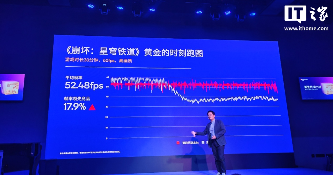 再比如 30 分钟《崩坏:星穹铁道》(60fps,高画质)黄金的时刻跑图测试中,第四代骁龙 8s 移动平台也可以达到 52.48fps 的平均帧率,领先竞品 17.9%。