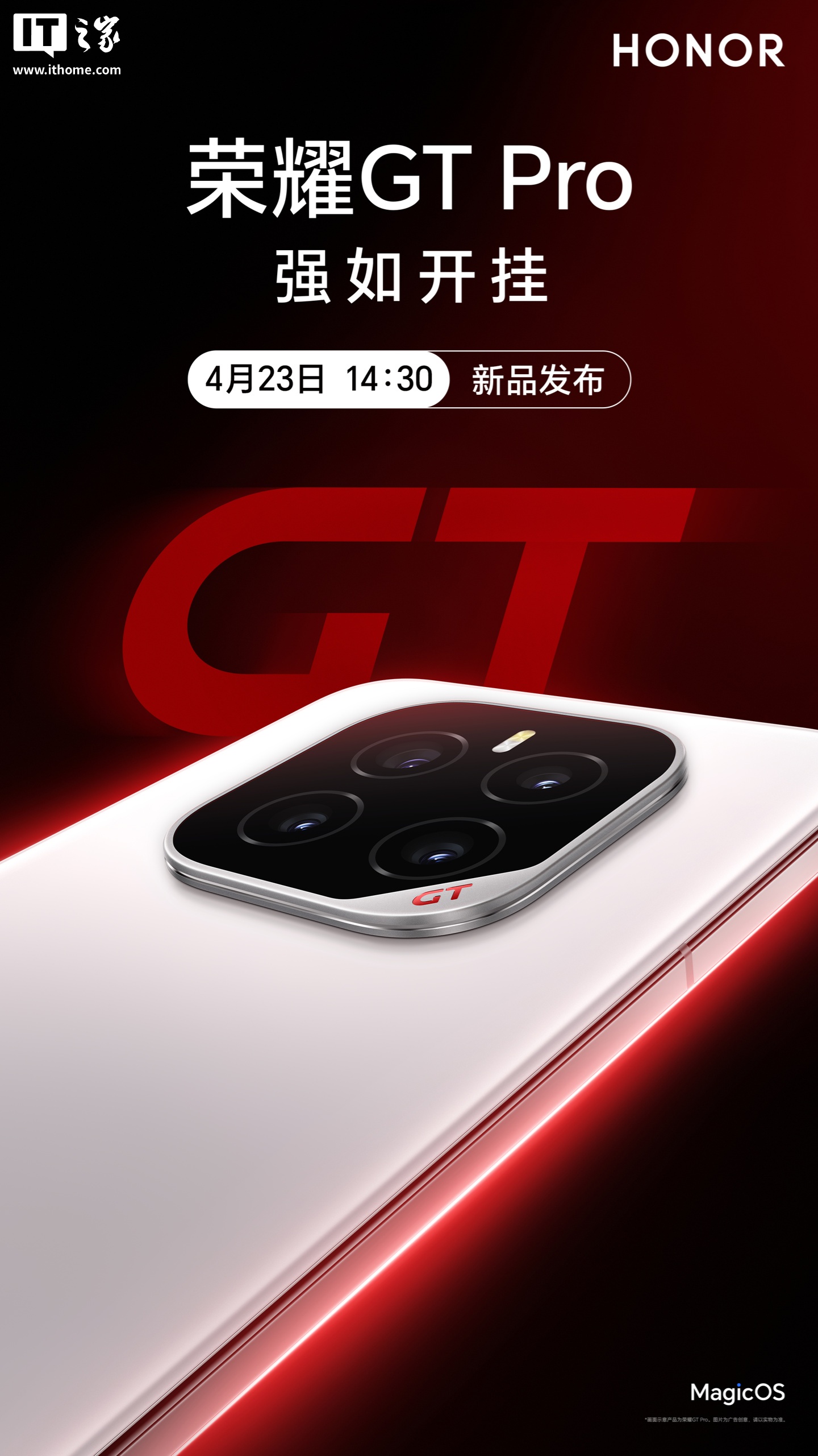 IT之家 4 月 16 日消息,荣耀手机官微今日宣布,定位“电竞性能旗舰”的荣耀 GT Pro 手机将于 4 月 23 日 14:30 正式亮相。