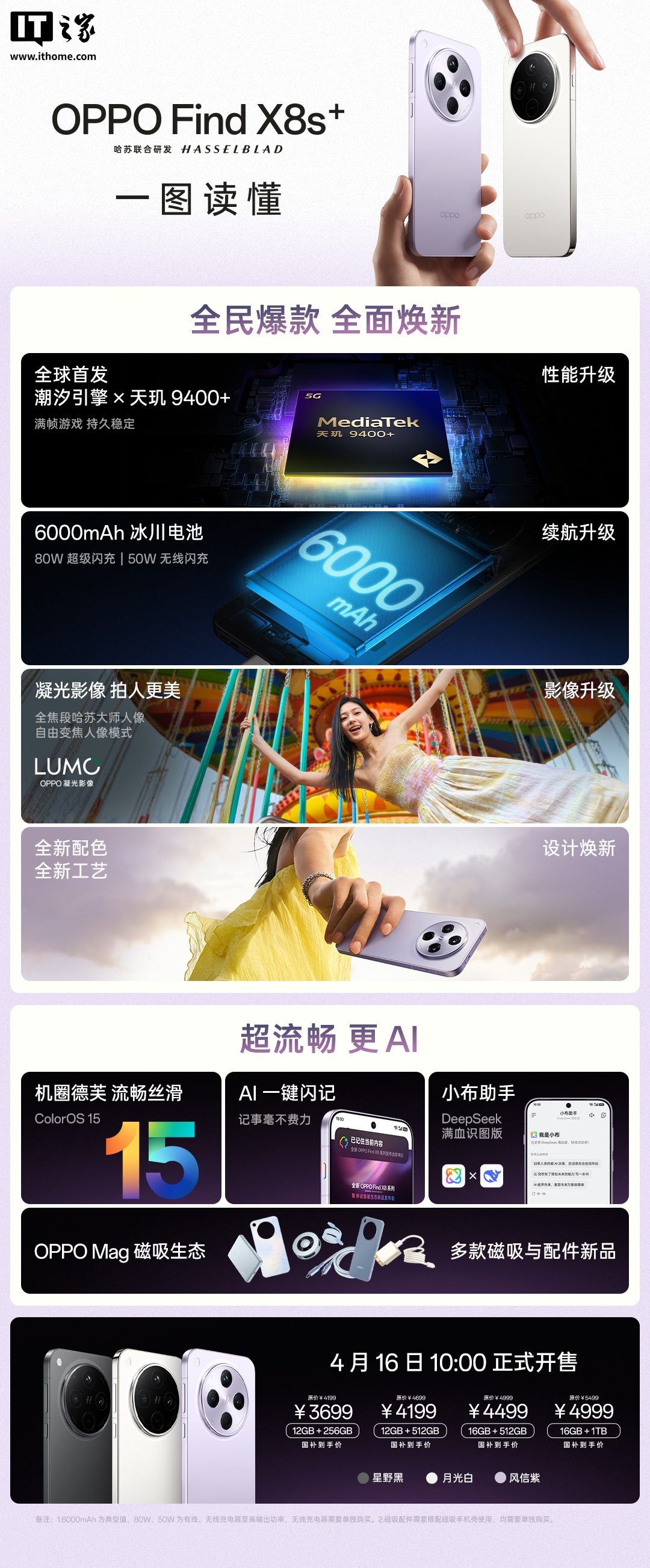 OPPO Find X8s + 同样搭载天玑 9400 + 处理器,配备了 6000mAh 的冰川电池,支持 80W 超级闪充和 50W 无线闪充。影像系统方面,Find X8s + 同样采用了哈苏人像技术,能够拍摄出更加出色的人像照片。