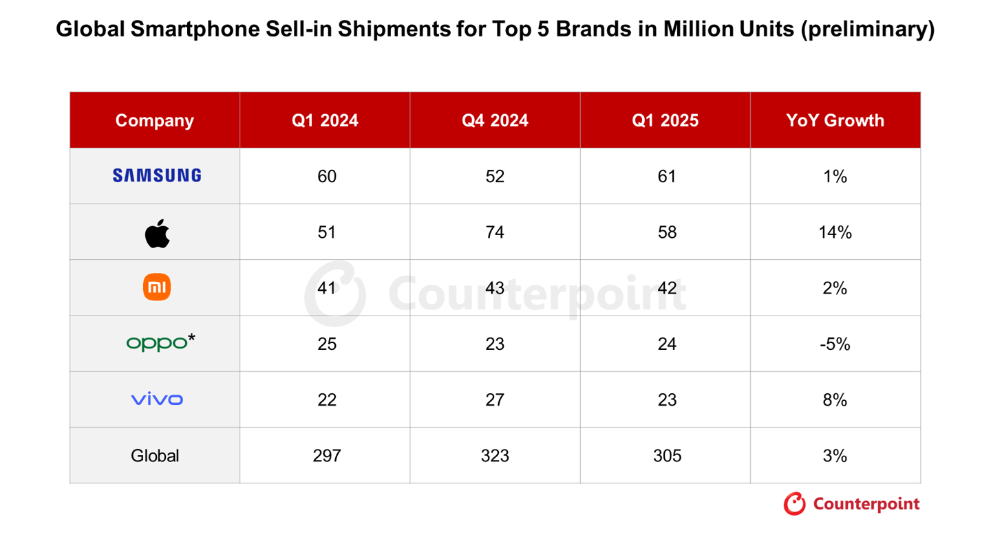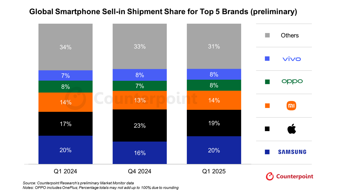 文章来源于互联网:CounterPoint 报告 2025Q1 手机出货:三星同比增 1%、苹果增 14%、小米增 2%