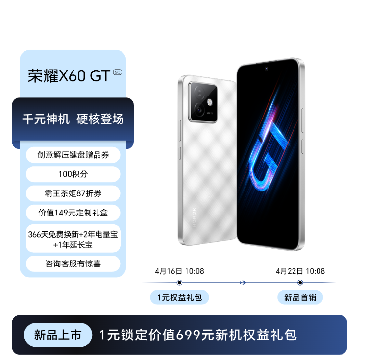IT之家 4 月 17 日消息,荣耀 X60 GT 手机已上架荣耀商城开启 1 元预约,新机号称“千元神机”,将于 4 月 22 日 10:08 首销。