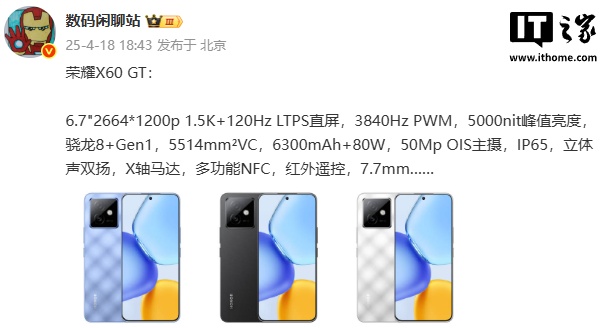 IT之家 4 月 18 日消息,荣耀 X60 GT 手机将于 4 月 22 日首销,博主 @数码闲聊站 今日曝光了这款新机的主要参数: