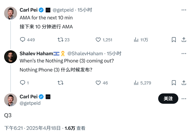 裴宇通过 X 平台举办了一场简短的 AMA 问答,当被问及 Nothing Phone(3)时,他表示:这款手机计划在“第三季度”上市。IT之家发现,此时间点大致与三星下一代折叠屏手机、谷歌新款 Pixel 系列以及新 iPhone 接近。参考 Phone(2)在 2023 年 7 月中旬登场的节奏,Phone(3)很有可能会在第三季度的前段时间亮相。