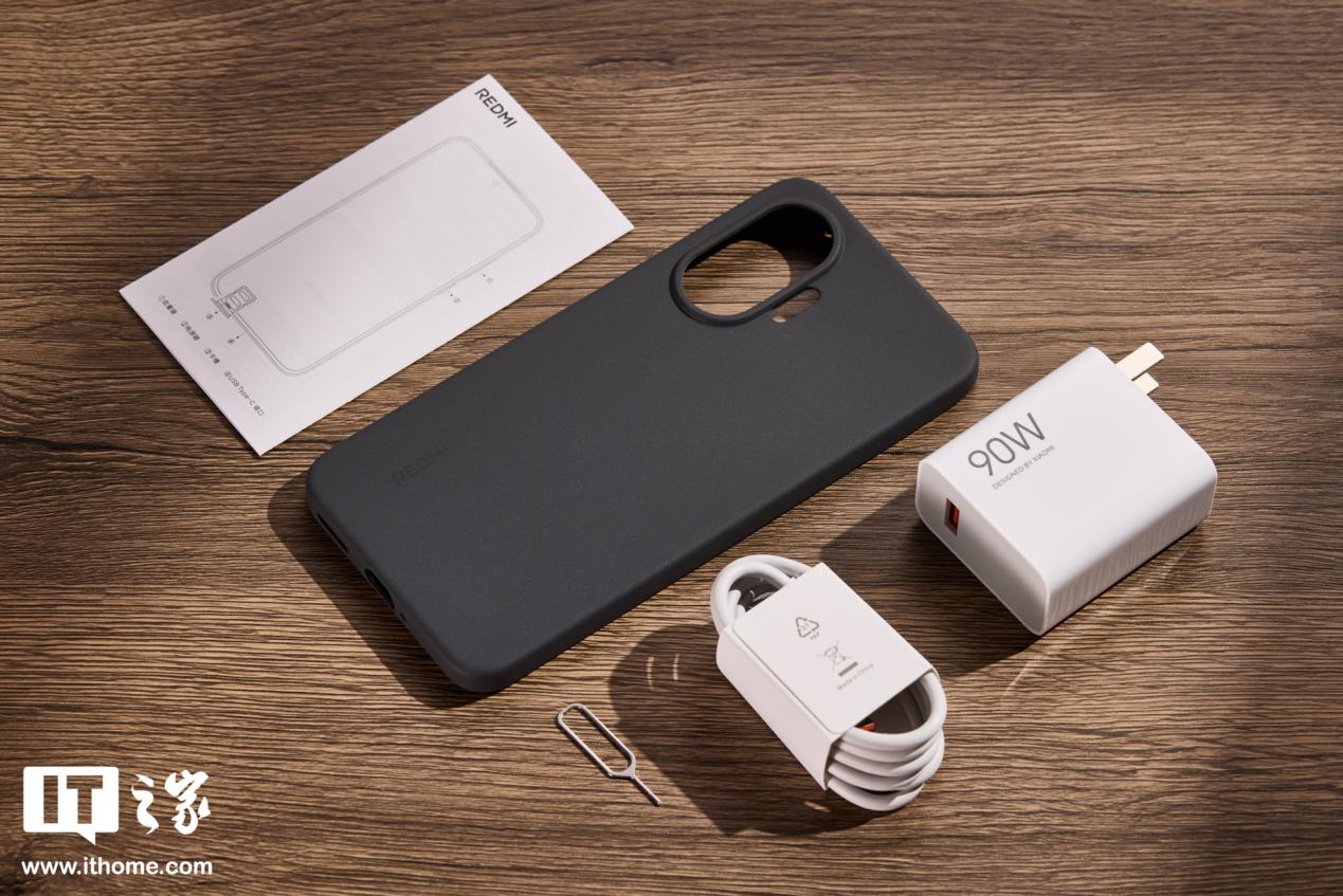 配件方面,REDMI Turbo 4 Pro 随机附赠了一个黑色硅胶保护套,还有 90W 充电器、数据线、取卡针和说明书等常规配件。