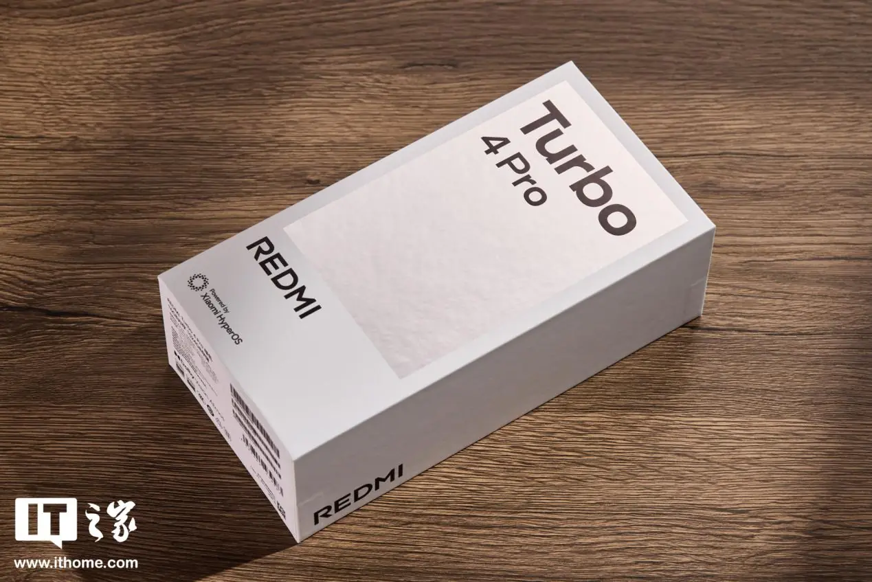 REDMI Turbo 4 Pro 和之前 REDMI Turbo 4 的包装盒设计是一样的,银灰色为底色,通过简单的图形和粗体文字搭配带来简洁时尚的视觉观感。
