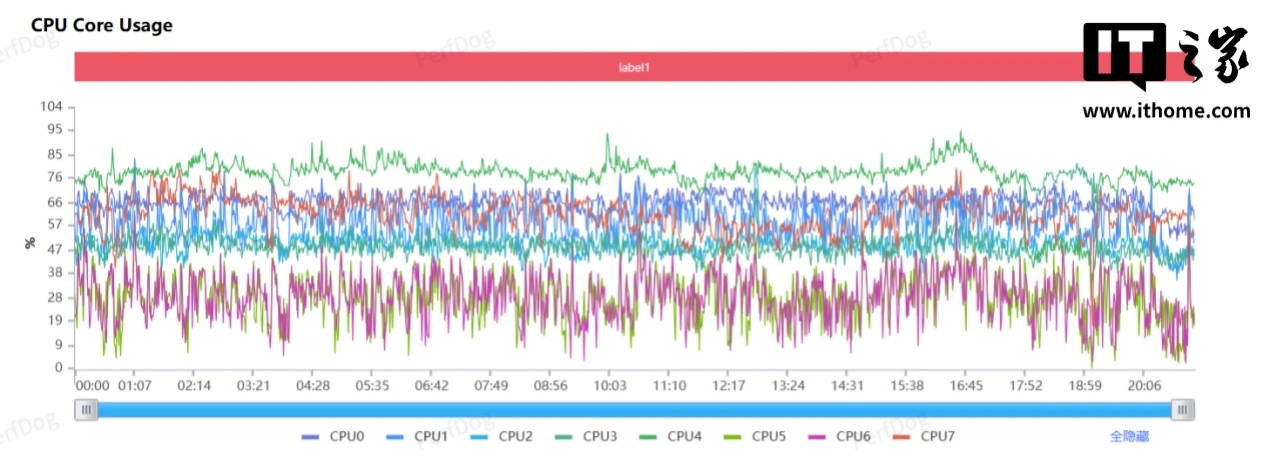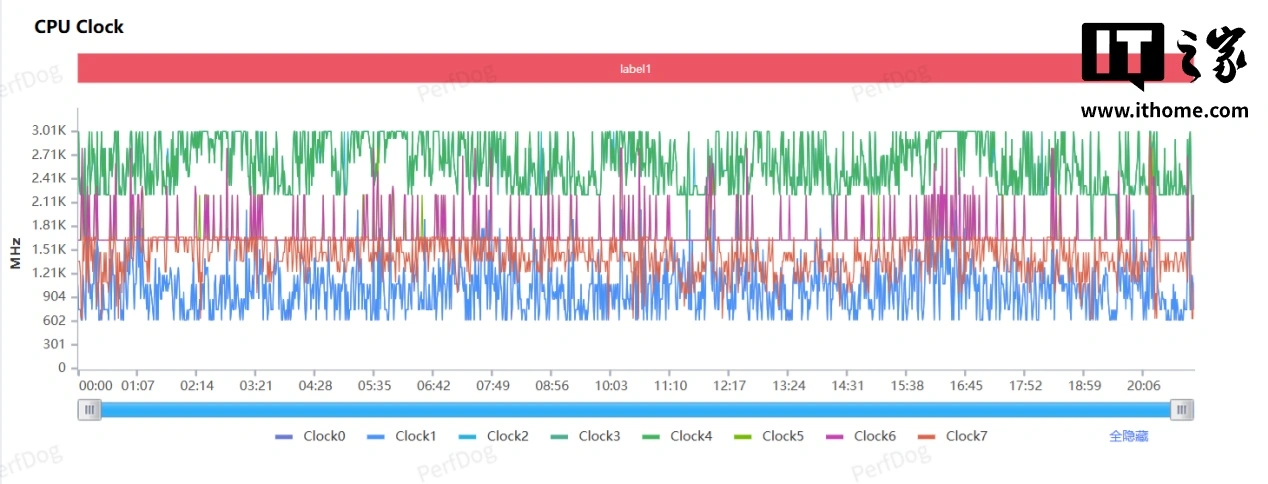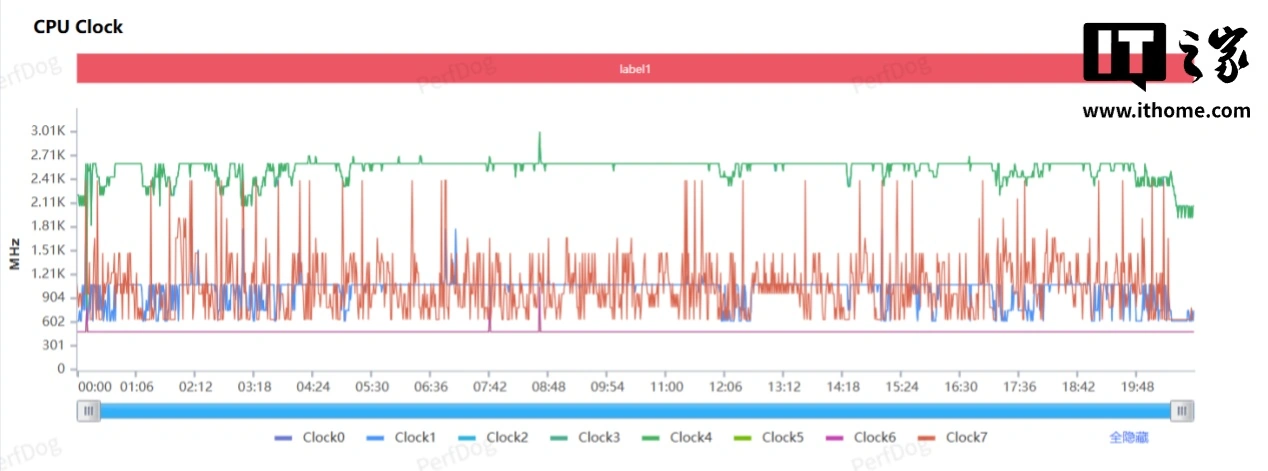 游戏中的平均功耗为 6.7W,其实这个数字也不低了。通过 CPU Clock 实时曲线图可以看到,骁龙 8s Gen4 处理器的 3 个 3GHz 大核的频率在游戏中平均维持在 2.8GHz 的水平,使用率均超过 50%,核心调度较为积极。