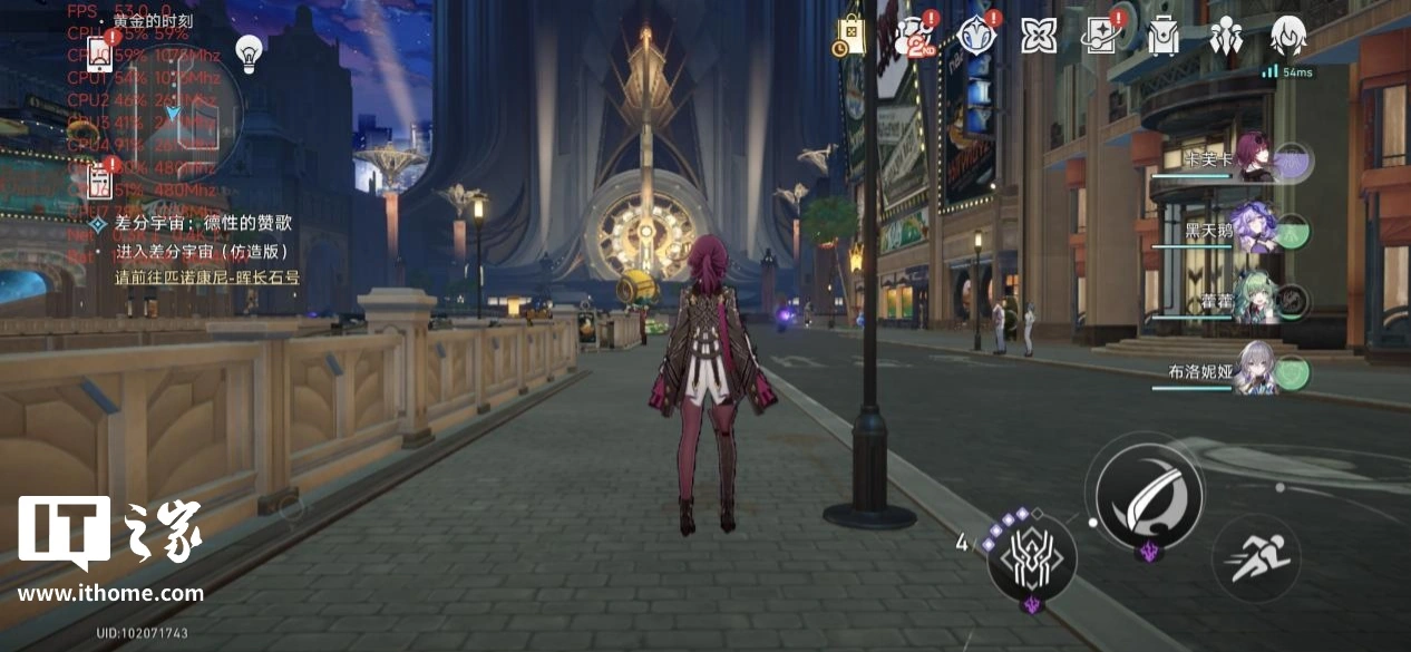 《崩坏:星穹铁道》时至今日依旧是手机游戏中对性能要求最高一档的产品,测试场景依旧选择了匹诺康尼-黄金的时刻,REDMI Turbo 4 Pro 适配的分辨率为 775P。