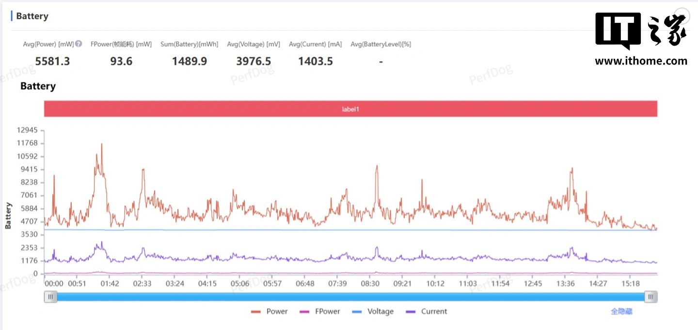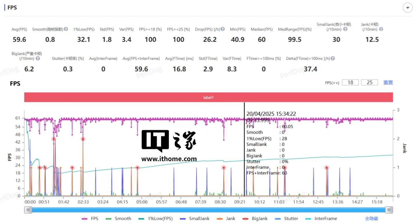 经过 15 分钟的跑图测试,最终游戏平均帧数为 59.6 帧。游戏过程中依旧出现了几次明显波动,不过整体帧率曲线相比《崩坏:星穹铁道》还是要平滑不少。