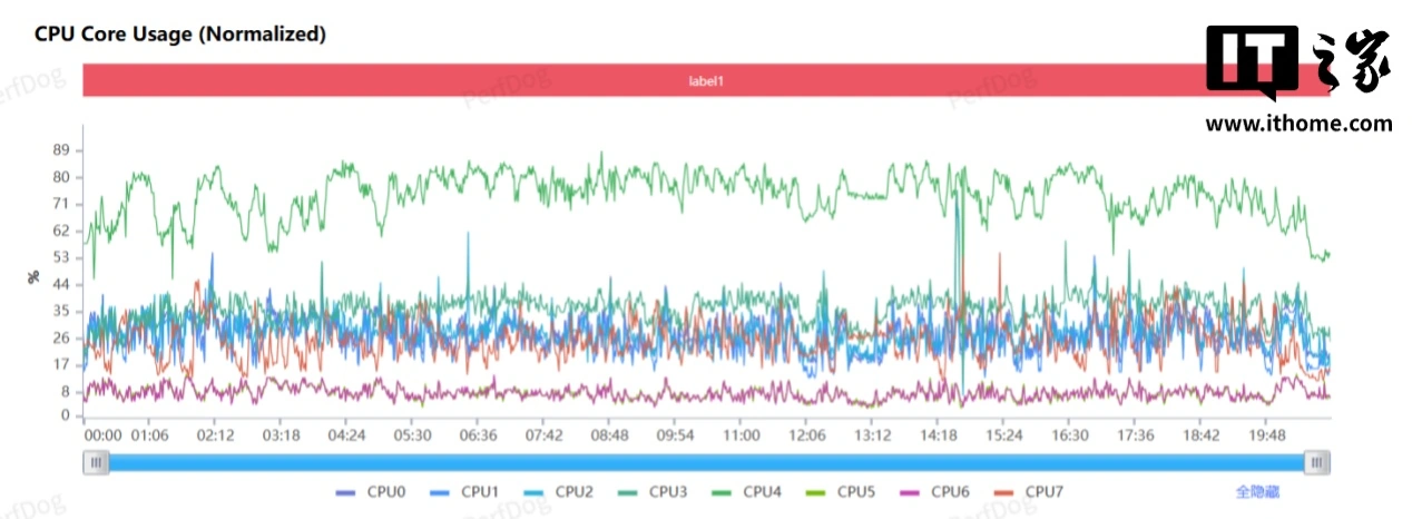 通过性能狗的 CPU 占用率和 CPU 频率图表可以看到,游戏中只有 1 个 CPU 核心利用率超过了 60%,并且 CPU 频率也保持在 2.5GHz 的高频,其他核心的使用率只有 35% 甚至更低,核心频率自然也不高,也就是说在 CPU 调度上 REDMI Turbo 4 Pro 对于《崩坏:星穹铁道》比《原神》更加保守。
