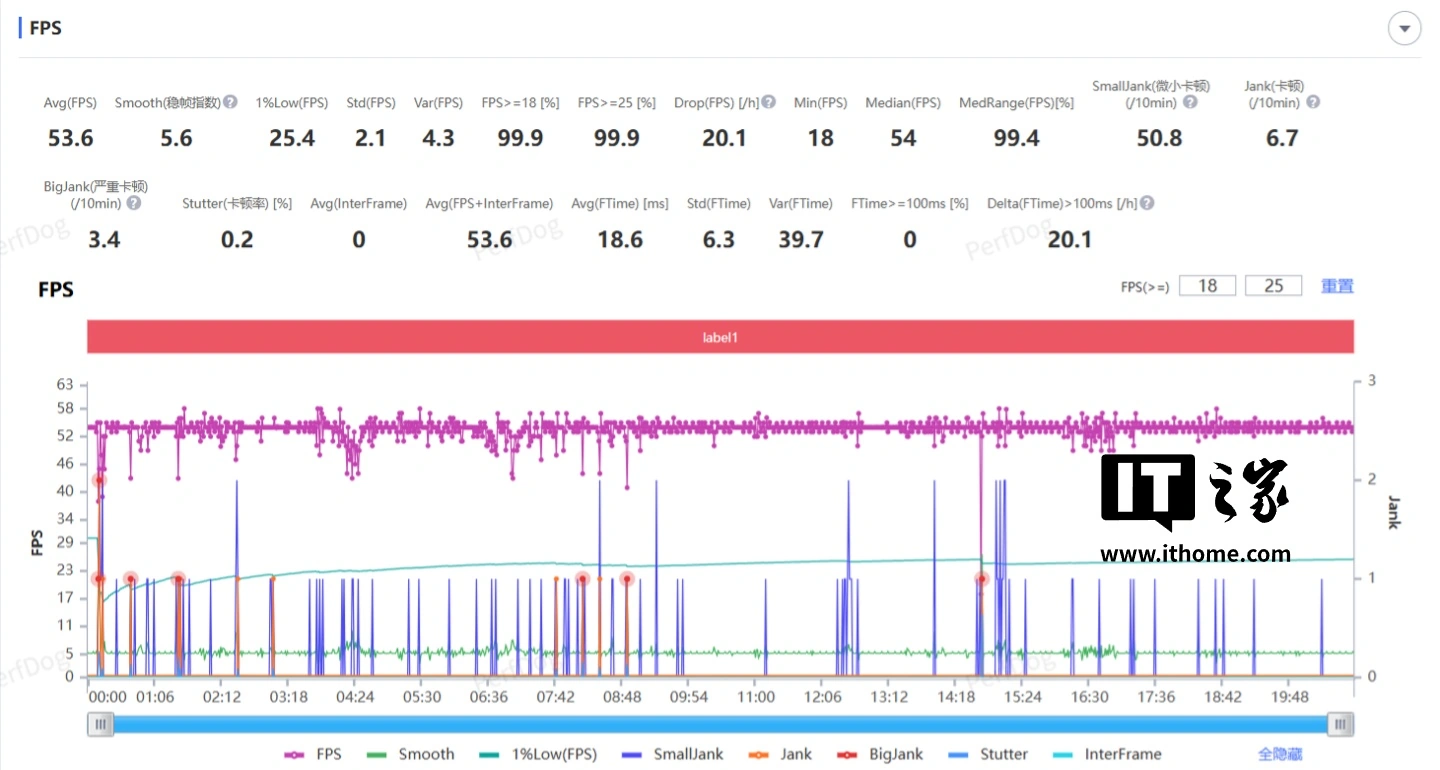 经过 20 分钟的跑图后游戏平均帧数为 53.6 帧,在测试进行到 3 分半-5 分钟左右出现了一次明显的帧数波动,6 分半左右也有一次,后面的帧率曲线相对就比较平顺了。