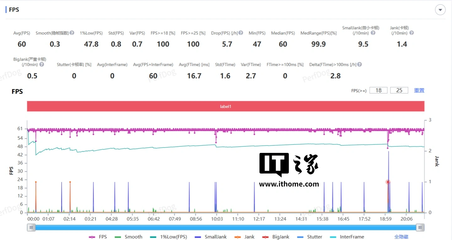 经过 20 分钟的大世界跑图 + 打怪,最终性能狗测出的游戏平均帧数为满帧 60 帧,帧率曲线较为平直,除了一两处明显波动外几乎就是一条直线,波动次数很少。