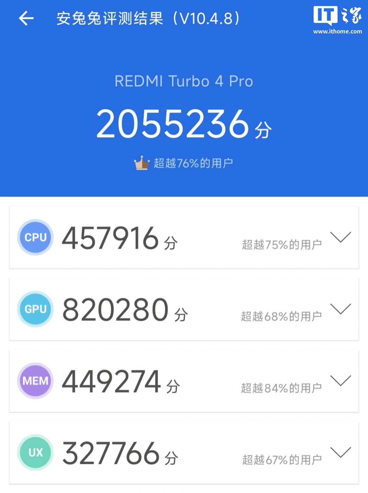 在IT之家的跑分实测中,REDMI Turbo 4 Pro 的安兔兔总分为 2055236 分,比较接近骁龙 8 Gen3 的跑分表现。