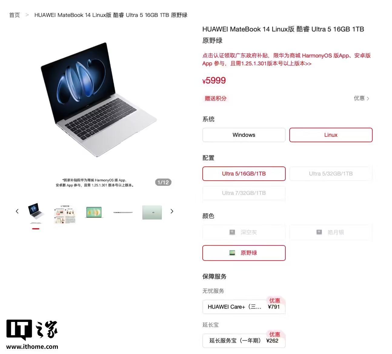 IT之家 4 月 13 日消息,华为 MateBook 14 笔记本 Linux 版现已在官网上架,可选三种版本,定价为 5999 元起,IT之家整理价格信息如下: