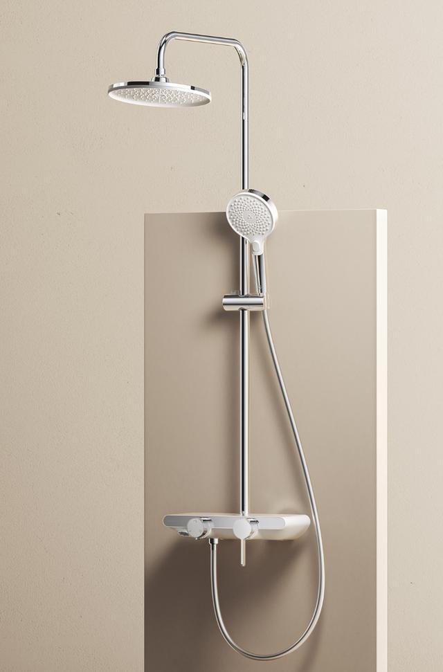 IT之家从商品页面获悉,这款新品采用大尺寸置物岛台设计,可放置沐浴露、洗发水、洗面奶等常用沐浴用品,承重 30kg,长度 320mm,宽度 118mm。控水旋钮可旋转切换手持花酒、顶喷花酒、下出水,主控把手支持开水、关水、调温、调节水量大小。