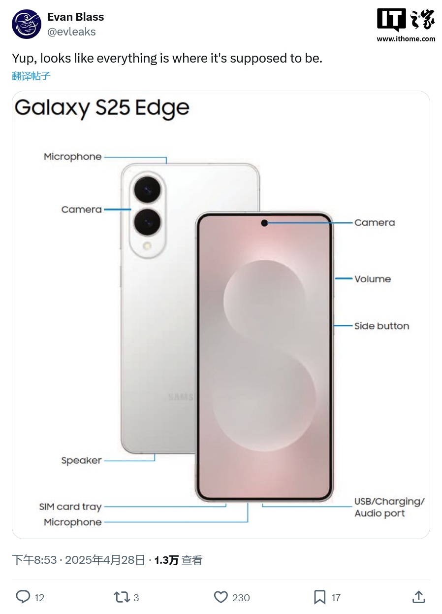 IT之家 4 月 29 日消息,消息源 Evan Blass(@evleaks)今天(4 月 29 日)在 X 平台发布推文,分享了三星最薄旗舰 Galaxy S25 Edge 手机的宣传物料图,展示该机的组件布局。