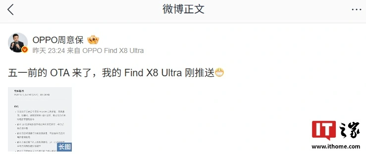 IT之家 4 月 29 日消息,据 OPPO Find 系列产品负责人周意保分享,OPPO Find X8 Ultra 手机现获五一前的 OTA 更新(版本号为 ColorOS 15.0.1.407)。新版本系统包大小约 351.54MB,新增支持全球首个原彩 ProXDR 实况等功能。