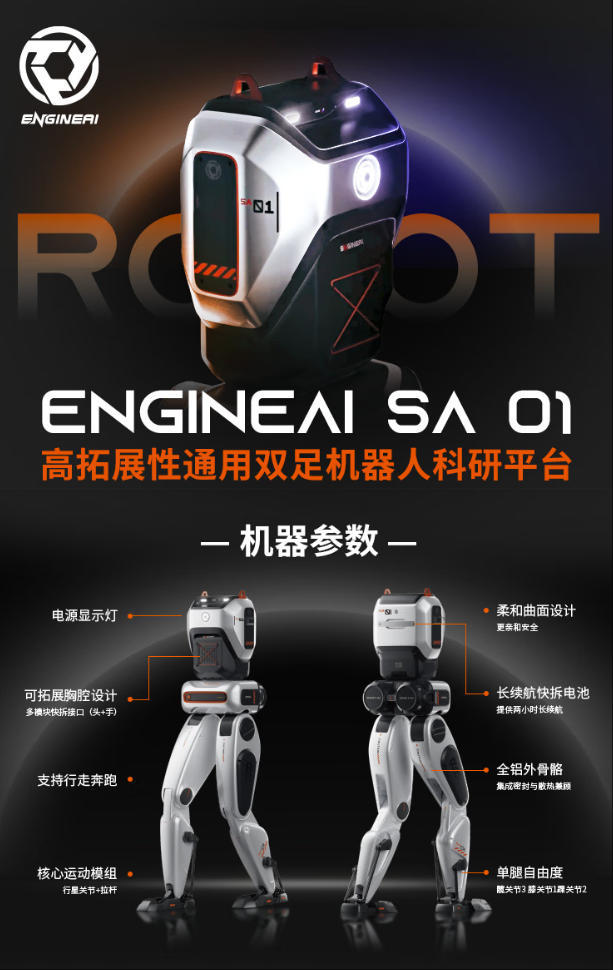 针对科研和教育市场,众擎推出的SA01双足机器人则采用更紧凑的设计,提供高拓展性的研究平台。该机器人拥有高达10-15公斤的负载能力,搭配全身外壳传感系统,能适应多种研究场景。其模块化设计支持开发者进行二次开发,为高校科研和机器人爱好者提供了理想的开发平台。