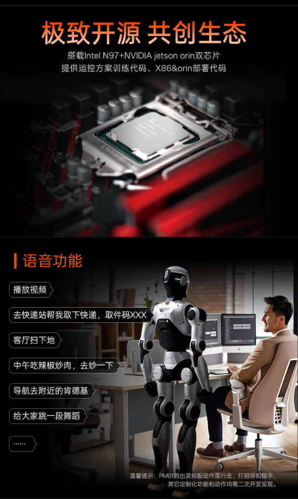 众擎科技强调,两款机器人均秉承“极致开源,共创生态”的理念,提供开放的运控方案训练代码,支持多种开发环境。PM01机器人还具备语音识别和交互能力,可执行播放视频、室内导航、舞蹈表演等多种功能,展现了其在家庭和商业环境中的实用潜力。