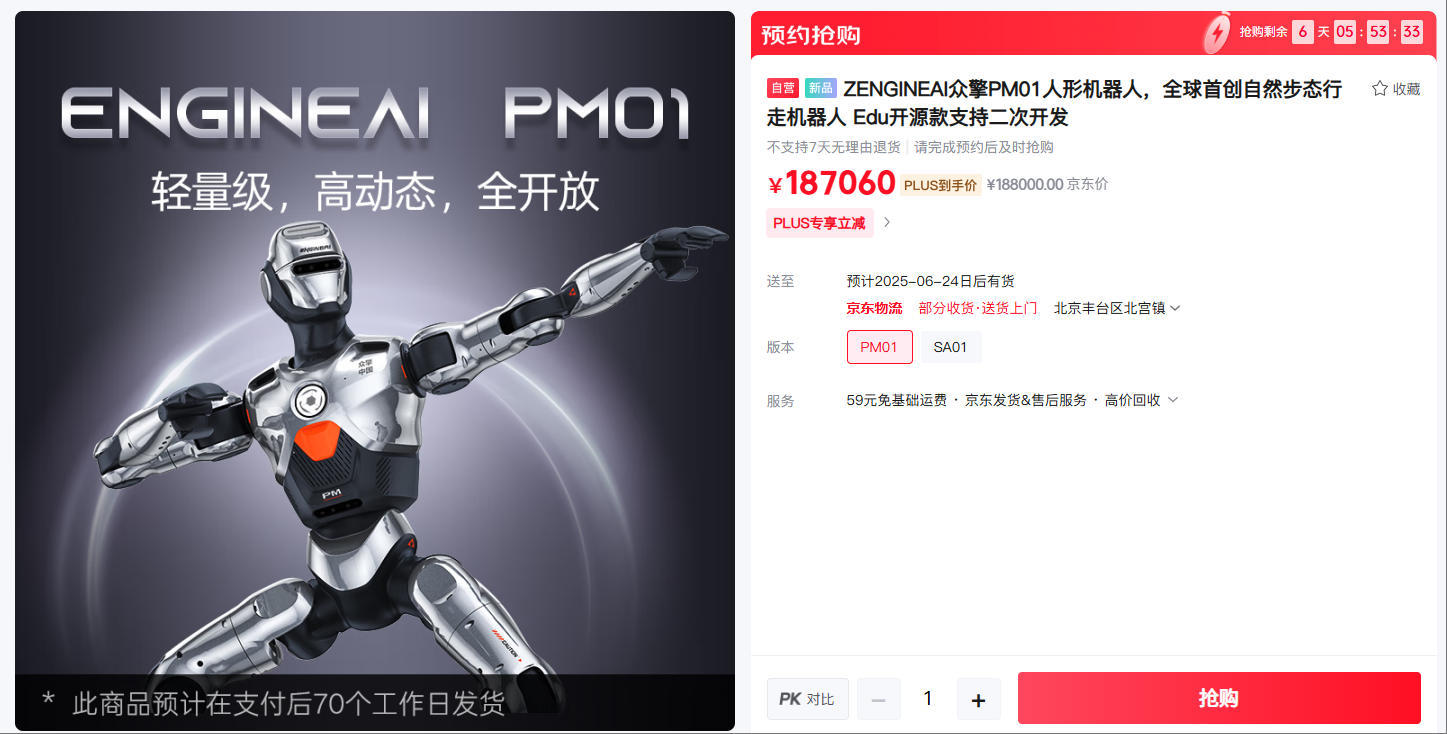 凤凰网科技讯(作者/于雷)4月15日,众擎科技今日宣布,近期在社交媒体上与“甲亢哥”合跳“斧头舞”走红的机器人已正式量产上市。这款名为“众擎 ENGINEAI PM01”的轻量级、高动态、全开放人形机器人现已在众擎京东自营旗舰店上架,售价18.8万元。同时,众擎还推出了另一款双足机器人产品——众擎 ENGINEAI SA01,售价4.2万元。京东Plus会员可立减940元与210元。