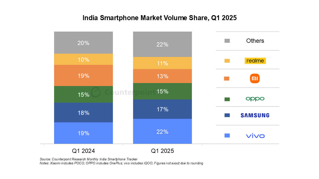 文章来源于互联网:CounterPoint 报告 2025Q1 印度手机出货量:vivo 占 22%、三星 17%、OPPO 15%、小米 13%、realme 11%