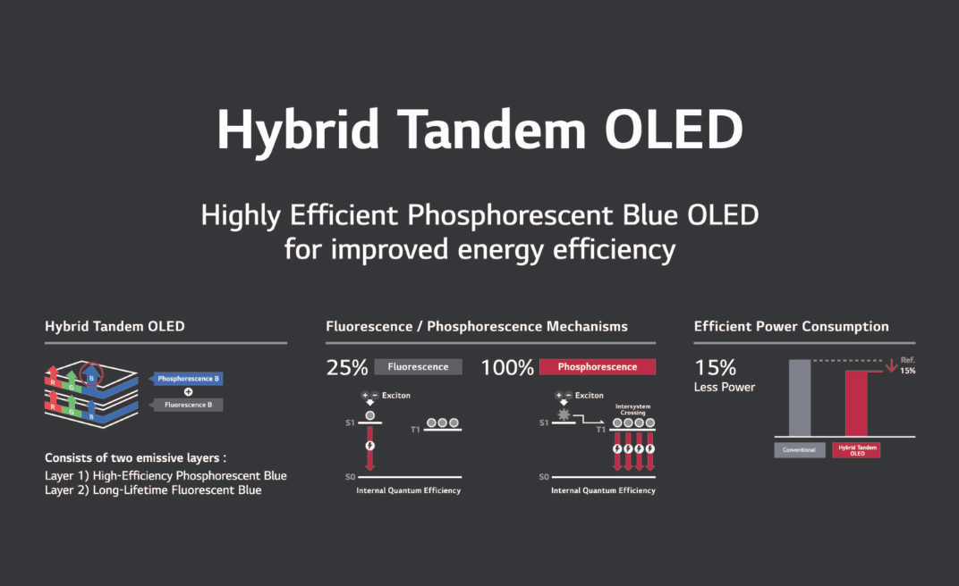 LG Display 通过采用混合双栈串联 OLED 结构解决了这个问题,其中下层堆栈产生蓝色荧光,上层堆栈产生蓝色磷光。通过结合荧光的稳定性和磷光的低功耗,它消耗的电量大约减少了 15%,同时保持了与现有 OLED 面板相似的水平稳定性。
