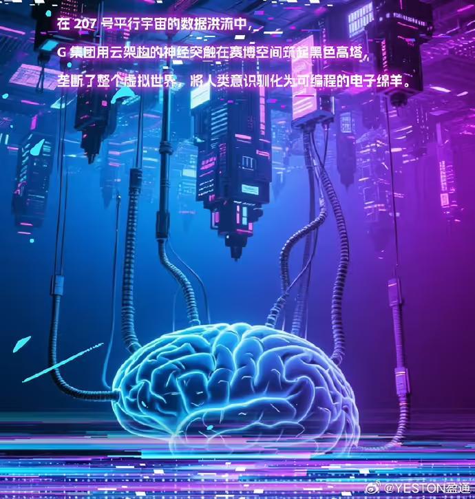 在 207 号平行宇宙的数据洪流中,G 集团用云架构的神经突触在赛博空间筑起黑色高塔,垄断了整个虚拟世界,将人类驯化为可编程的电子绵羊。