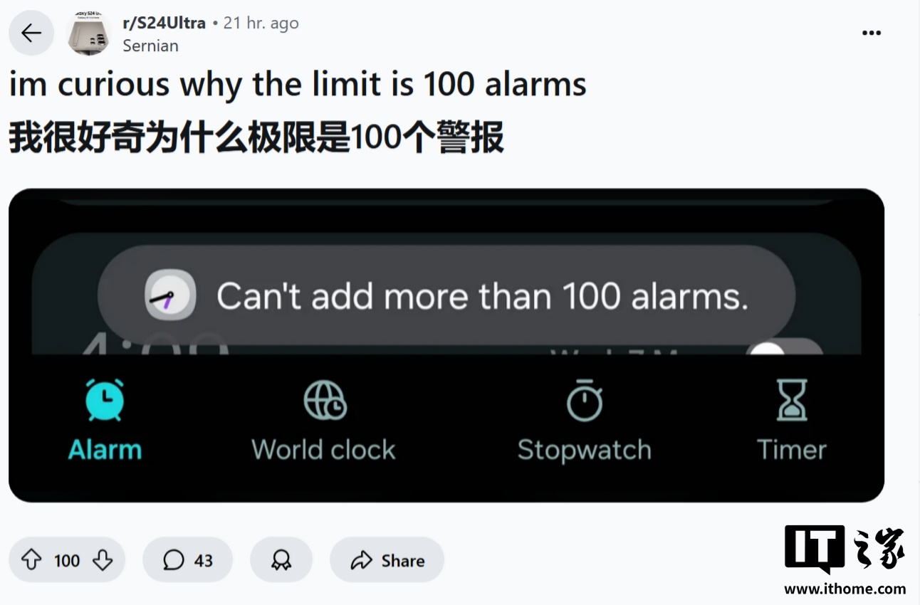 Reddit 用户 Sernian 昨日发现,一旦达到 100 个闹钟,用户将无法再新增。IT之家注:这一限制并非仅限于 Galaxy S24 Ultra,包括最新的 Galaxy S25 Ultra 在内的其他三星设备,同样受此约束。