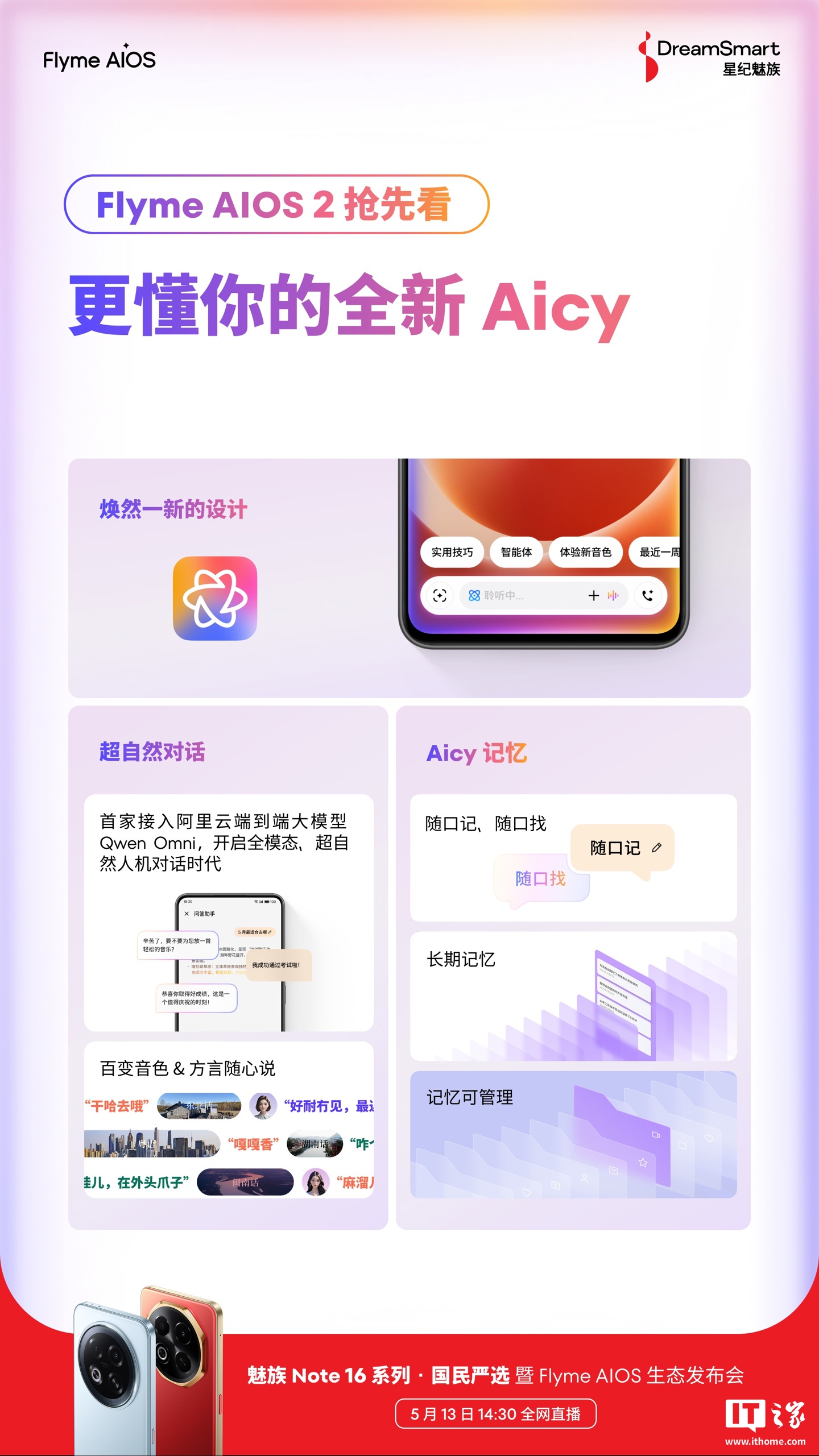 据IT之家昨日报道,Flyme AIOS 2 新版本将带来全新 Aicy,其拥有更具呼吸感更灵动的全新设计,接入阿里云端到端大模型 Qwen Omni(号称“首家接入”),支持更低延时更有感情的超自然语音对话(提供百变音色、方言随心说等能力)。