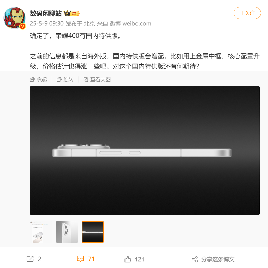 此前我们并不清楚国内版和海外版的荣耀 400 系列是否会有差别,但今天,微博博主 @数码闲聊站 给出了爆料,他表示,荣耀 400 确定会有国内特供版。