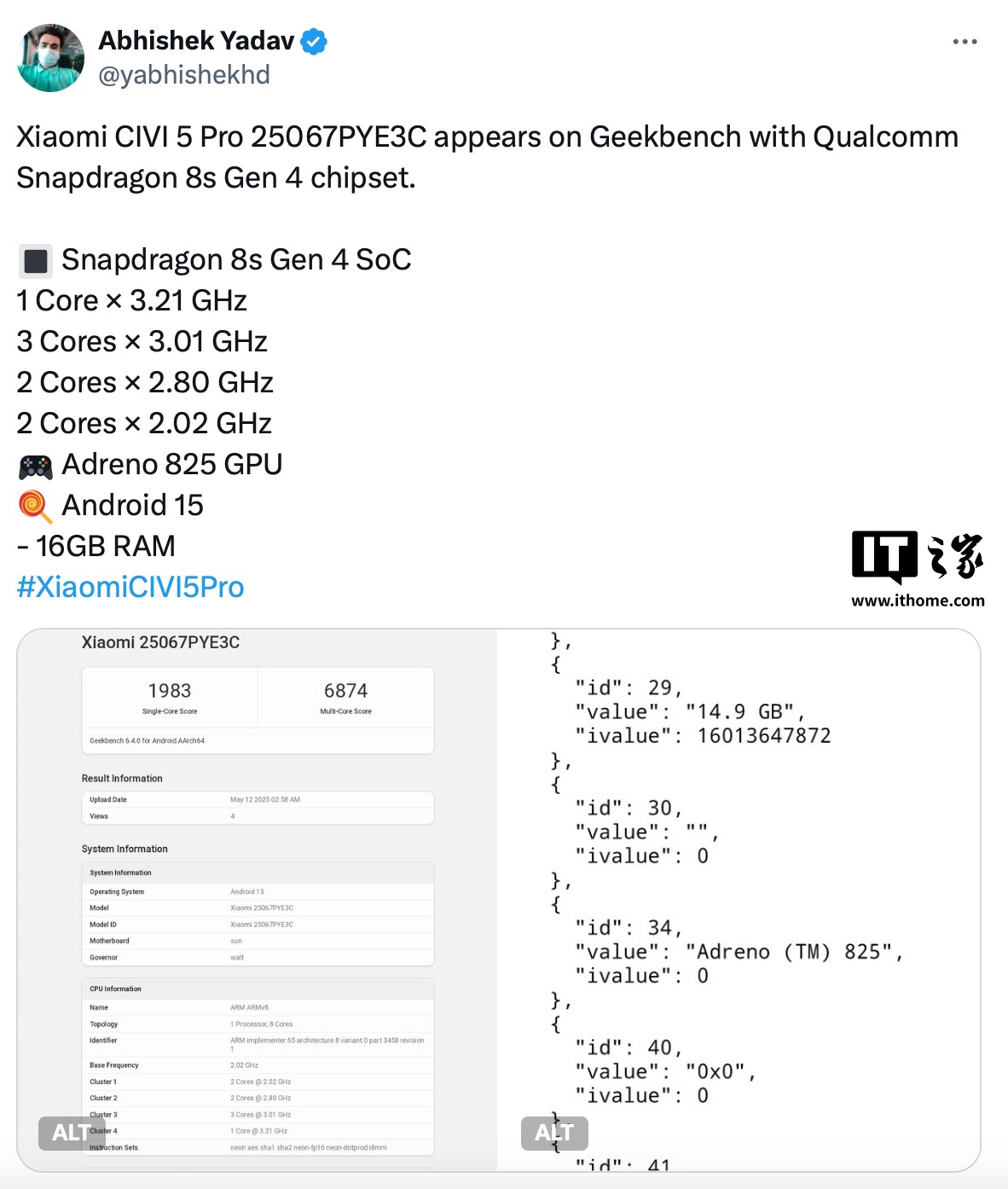IT之家 5 月 12 日消息,消息人士 Abhishek Yadav 今日于 X 平台上表示,一款型号为 25067PYE3C 的小米手机现已现身 Geekbenck 数据库,预计为小米 Civi 5 Pro。